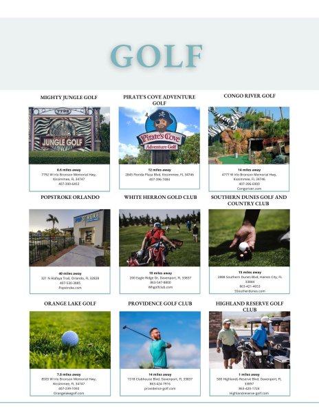 Just 35 minutes from the Orlando International Airport. Universal Studios, Sea World, Lego Land, and Disney Theme Parks are less than 30 minutes away. In addition, the newly opened Margaritaville Resort and Island H2O Water Park are only 5 minutes away. Also in the area is the Sunset Walk with entertainment, restaurants, and shopping.